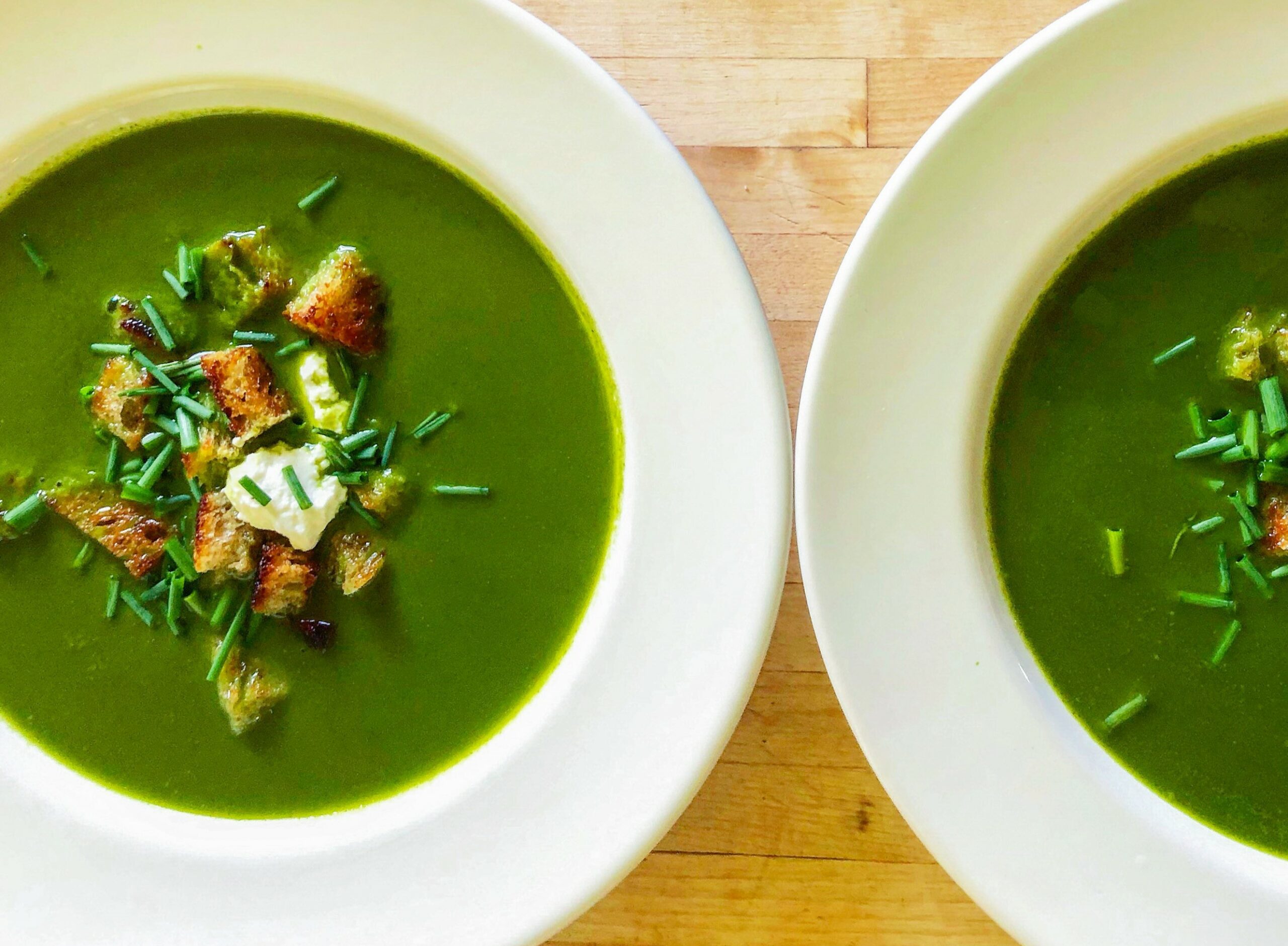 Blend the soup with an immersion blender or in batches using a high-speed blender (for safety, fill the vase ½ full each time). Return blended soup to the pan and adjust seasoning as needed. Warm through if serving hot or chill in the refrigerator until cold. Serve with a dollop of yogurt, chopped chives, and croutons, if using.